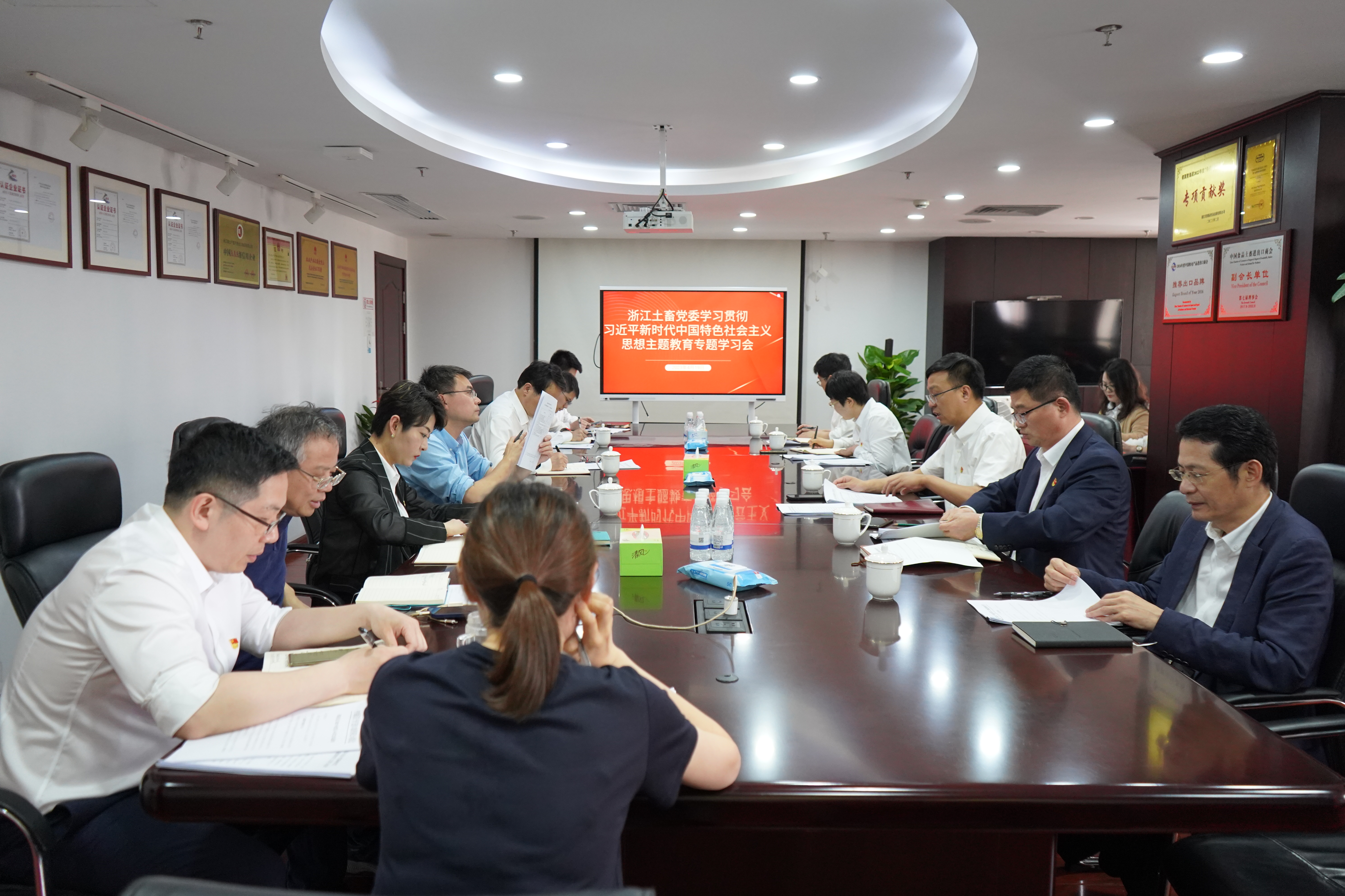 浙江土畜領(lǐng)導(dǎo)班子、中層以上干部和各黨支部支委委員參加會議,成員公司中層干部在分會場參加視頻會議,普通黨員和全體職工通過手機(jī)端釘釘APP參會。